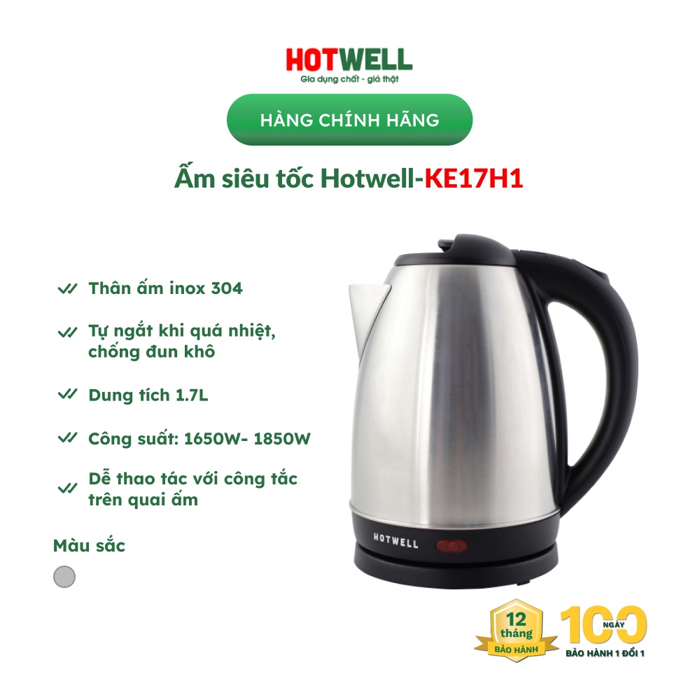 Hotwell là thương hiệu gia dụng Việt thuộc Công ty Cổ phần Masscom Việt Nam - một trong 500 công ty công nghệ lớn nhất Việt Nam. Hotwell là hãng gia dụng đầu tiên có chế độ hậu mãi tuyệt vời chưa từng có hiện nay: sản phẩm được cam kết bảo hành 1 đổi 1 mới trong 100 ngày sau khi mua cùng thời gian bảo hành lên tới 12 tháng, giúp người mua hoàn toàn an tâm khi dùng ấm siêu tốc Hotwell KE17H1Với những thế mạnh chính gồm tiện dụng, nhanh chóng, tiết kiệm và an toàn, ấm siêu tốc Hotwell KE17H1 sẽ là sự lựa chọn lý tưởng để phục vụ cho nhu cầu đun nước dùng cho những hoạt động thiết yếu thường ngày của mỗi hộ gia đình và văn phòng làm việc.
