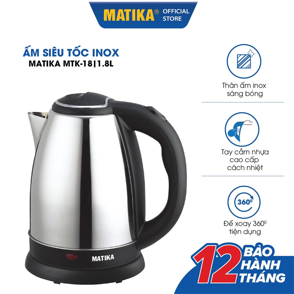 Giới thiệu [Mã BMBAU50 giảm 10% đơn 99k] Ấm Siêu Tốc MATIKA Inox 1.8L MTK18