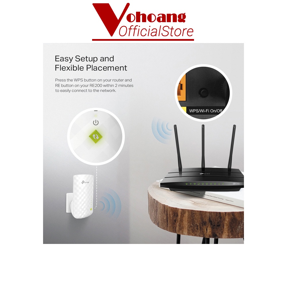 📌 Kết Nối Với Nút WPS: Nhấn nút WPS trên router và nút RE trên RE200 của bạn trong vòng 2 phút để dễ dàng kết nối với mạng. Sau khi kết nối với router hiện có, bạn chỉ cần định vị lại RE200 tại bất kỳ vị trí nào để có được cường độ tín hiệu tốt nhất.