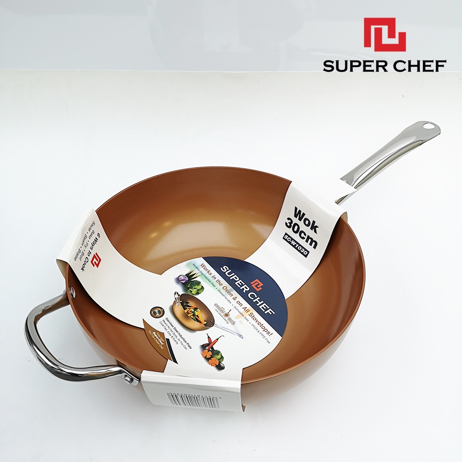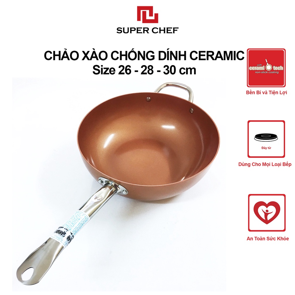 CHẢO CHỐNG DÍNH SÂU LÒNG SUPER CHEF dạng chảo xào được đánh giá vượt trội hơn nhờ được phủ 2 lớp chống dính Ceramic theo công nghệ Nhật và có nhiều ưu điểm vượt trội:1️⃣ Thiết kế chảo với lòng sâu hơn12cm, vành to rộng đến 30cm, chiên xào đều tiện lợi.