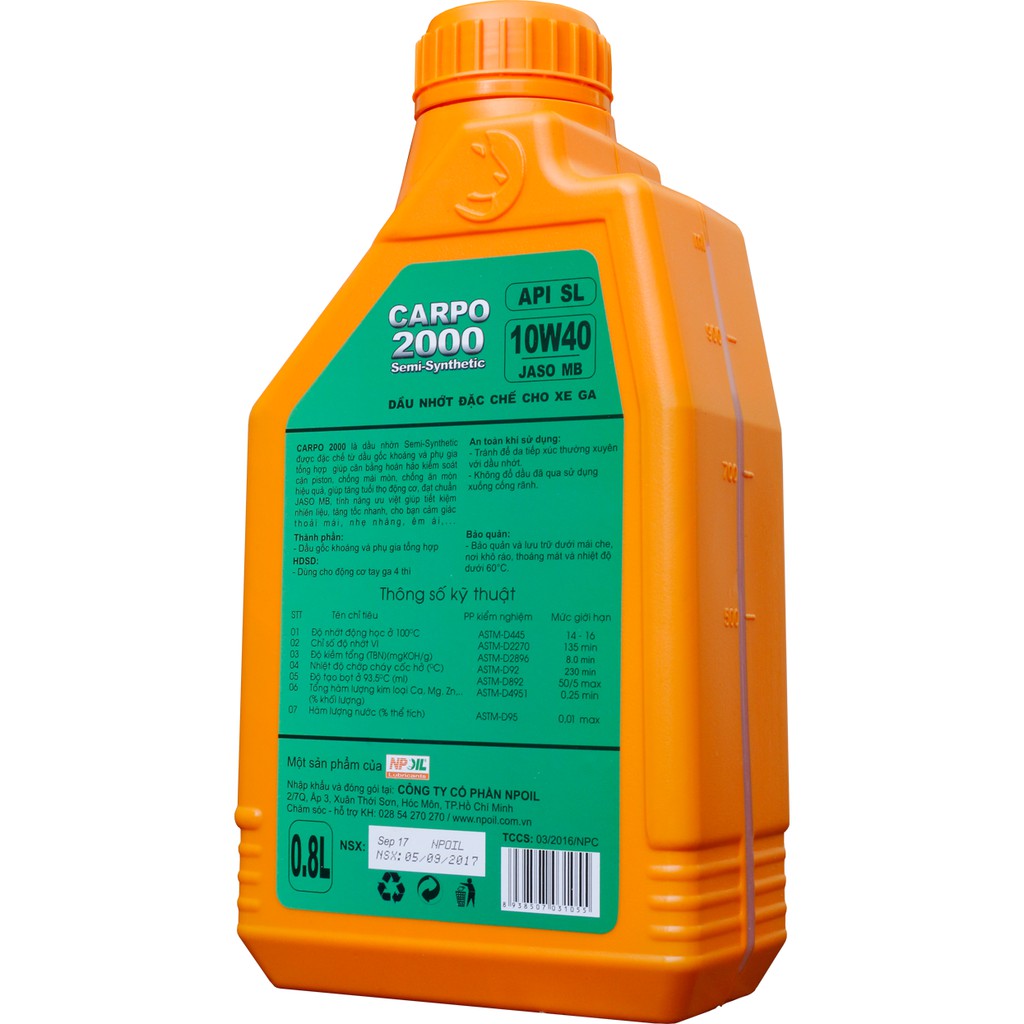 Dầu nhớt CARPO 2000 là dầu nhờn động cơ 4 thì cao cấp đặc chế cho xe tay ga. Công nghệ REMETALL MỚI cho phép duy trì bôi trơn hoàn hảo ngay cả trong điều kiện giao thông phức tạp ở nội đô, giúp xe lướt êm ngay từ lần đầu sử dụng.CARPO 2000 là dầu nhờn Semi-ynthetic được đặc chế từ dầu gốc khoáng và phụ gia tổng hợp giúp cân bằng hoàn hảo kiểm soát cặn piston, chống mài mòn, chống ăn mòn hiệu quả, giúp tăng tuổi thọ động cơ, đạt chuẩn JASO MB, tính năng ưu việt giúp tiết kiệm nhiên liệu, tăng tốc nhanh, cho bạn cảm giác thoải mái, nhẹ nhàng, êm ái, …