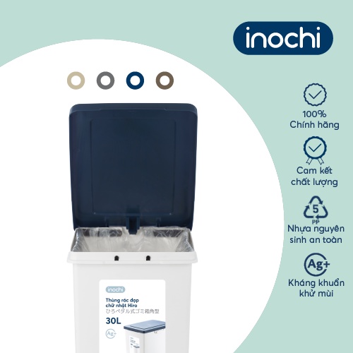 Thùng rác đạp chữ nhật Inochi - Hiro 30L (kèm ruột) Màu sắc: Thân Trắng kem + Nắp Ghi/ Xanh/ Nâu/ Be