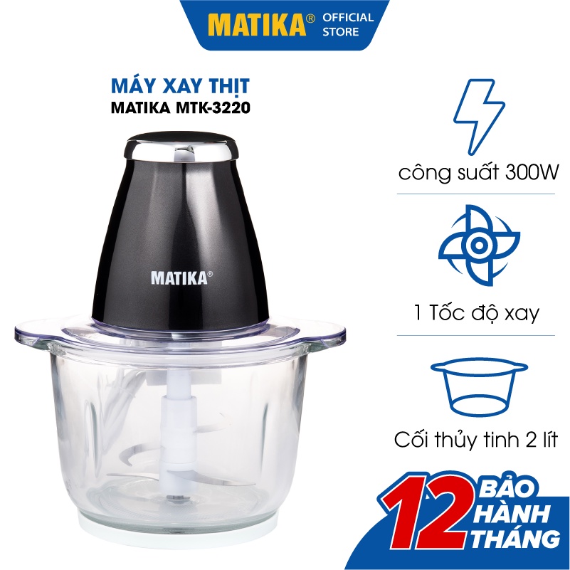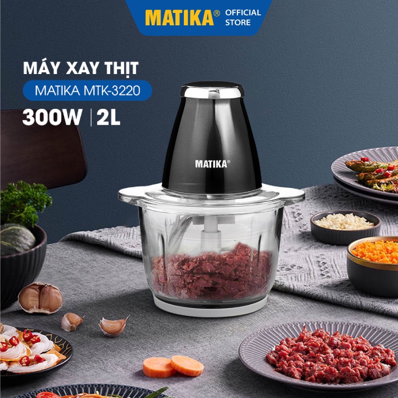 Máy Xay Thịt MATIKA 2L Cối Thủy Tinh MTK-3220Máy xay thịt Matika MTK-3220 dung tích cối xay 2L bằng thủy tinh trong suốt cao cấp, công suất 300W cùng lưỡi xay bằng thép không gỉ siêu khỏe giúp xay nhanh, nghiền nhuyễn thực phẩm dễ dàng.