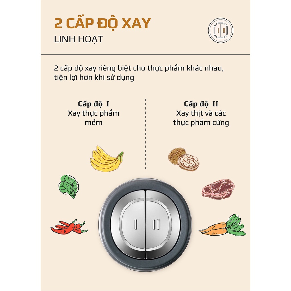Cấp độ I: Bánh răng chậm thích hợp xay các thực phẩm mềm: rau củ, nấm, ớt.