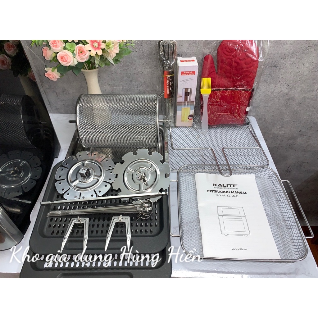 Khi chọn mua nồi chiên không dầu Kalite KL- 1500, bạn sẽ được sở hữu trọn bộ sản phẩm nồi chiên cùng với những phụ kiện hỗ trợ nấu ăn như: Xiên quay, Giỏ/lồng quay, Nhông quay, Dụng cụ lấy đồ, Khay hứng dầu ăn, Vỉ nướng chống dính, Sách nấu ăn và Sách hướng dẫn sử dụng.