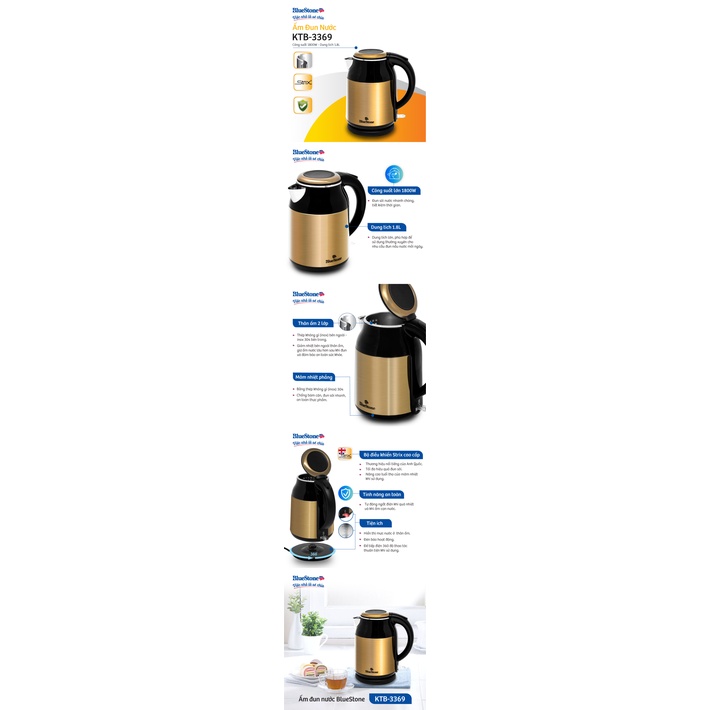 Nổi bật với thiết kế hiện đại, tinh tế, màu vàng đồng sang trọng, tích hợp nhiều tính năng thông minh, tiết kiệm thời gian và tối ưu việc nấu nướng, ấm siêu tốc BlueStone KTB-3369 là sự lựa chọn phù hợp cho những căn bếp hiện đại.
