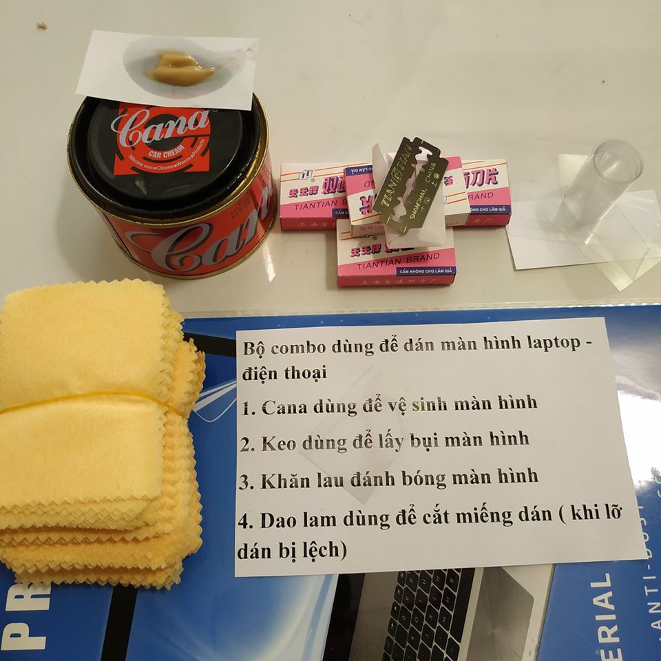 KHÁCH NÊN MUA BỘ COMBO DỤNG CỤ DÁN MÀN HÌNH GỒM: CANA, KEO LẤY BỤI, KHĂN LAU VÀ DAO LAM ĐỂ TIẾT KIỆM CHI PHÍ VÀ THỜI GIAN VỚI GIÁ CHỈ 7K.KHÁCH CHỌN SỐ LƯỢNG MIẾNG DÁN VÀ SIZE MÀN HÌNH CỦA LAPTOP THÊM VÀO GIỎ HÀNG, RỒI CHỌN THÊM COMBO DÁN MÀN HÌNH NHÉ!