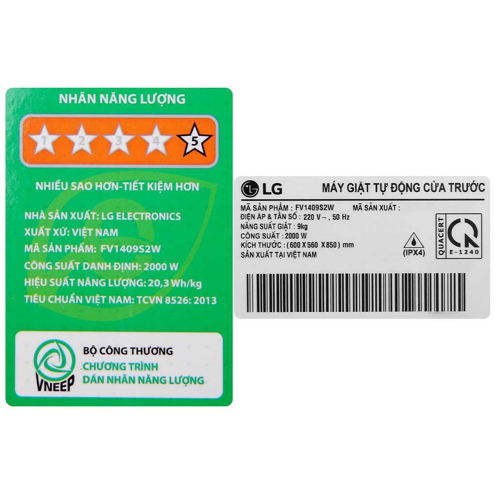 [Mã ELHA03 giảm 5% đơn 300K] [LG FV1409S2W] Máy giặt LG Inverter 9 kg FV1409S2W