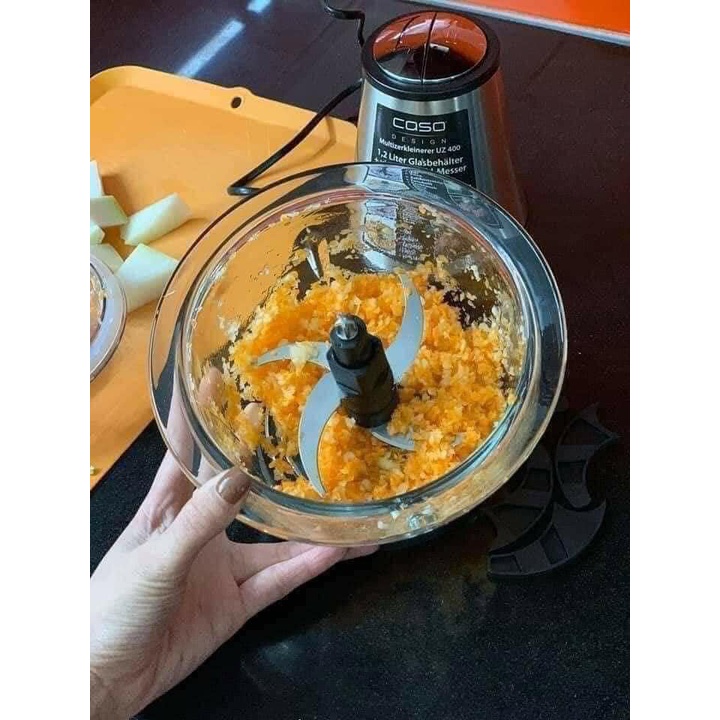 Công dụng Máy xay thịt Caso Uz400- Máy xay điện, với dao 4 lưỡi cực khoẻ, cối thuỷ tinh rất đẹp và vệ sinh, nắp inox bóng loáng, chỉ cần 1 nút ấn rất dễ dùng. Nhấn vài giây là xong, thịt - cá - cua - đá - hạt,... đều xay được dễ dàng, giúp bạn tự tay chế biến rau, thịt xay, củ,... tại nhà sạch sẽ vệ sinh, đảm bảo an toàn thực phẩm. Ngoài chức năng xay thịt máy còn cắt nhỏ trái cây, rau, hành, tỏi, thịt, cá, các loại hạt,... trong vòng vài giây.