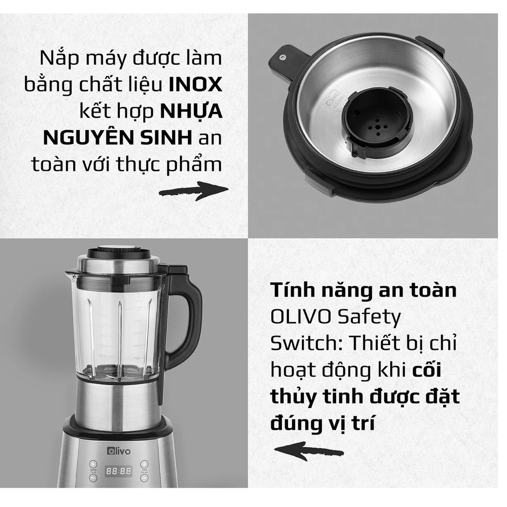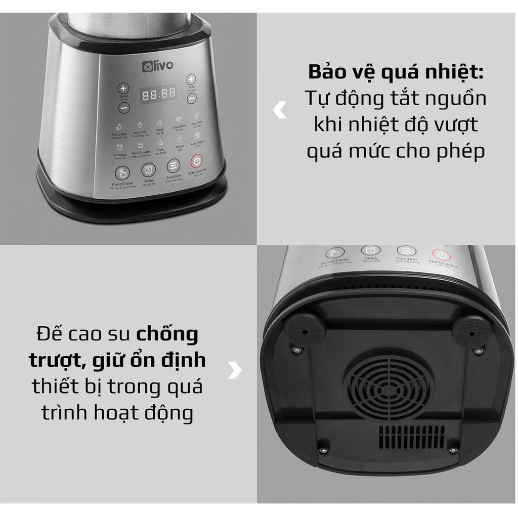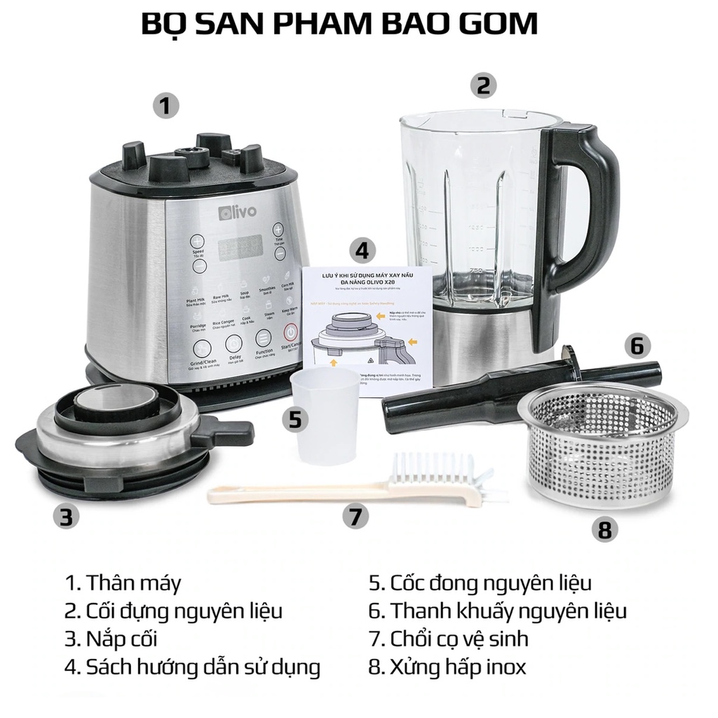 OLIVO X20 Nấu đến 1,5l Sữa hạt vẫn không bị tràn Xay siêu mịn, KHÔNG CẦN LỌC BỎ BÃ khi nấu xong Giảm ồn đến 10% so với các dòng máy khác Thân máy INOX 304 chắc chắn Nắp máy INOX kết hợp công nghệ chống tràn đảm bảo an toàn và vệ sinh