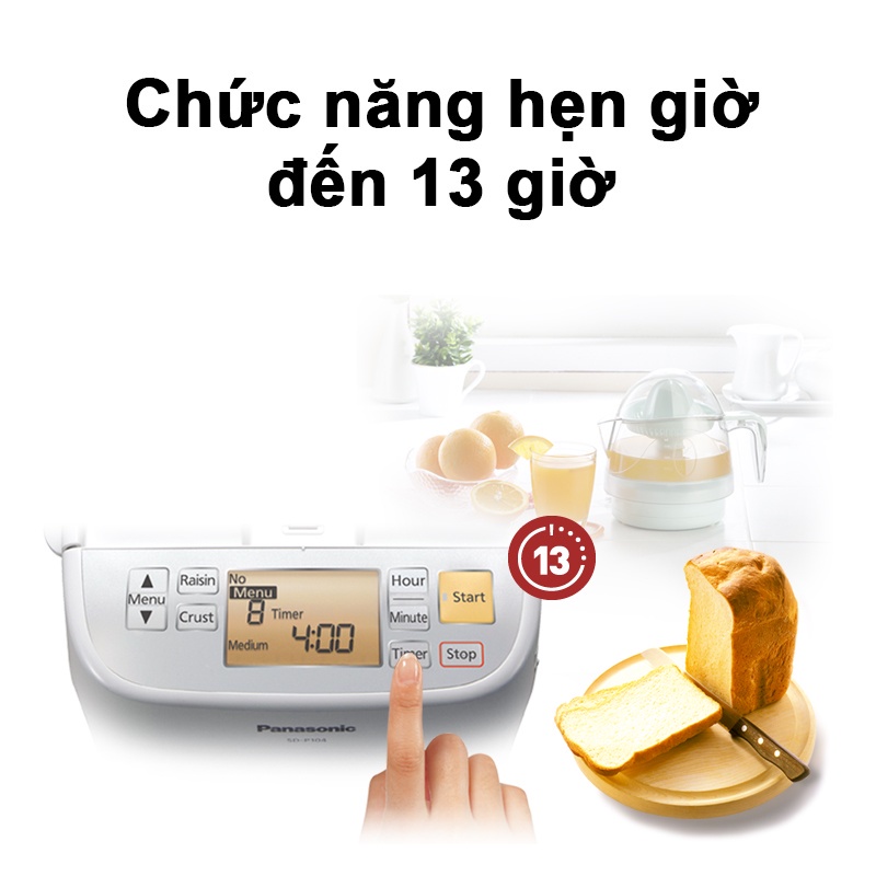 Minh họa tính năng của bộ hẹn giờ kỹ thuật số. Bạn có thể đặt bật máy tự động tối đa 13 giờ để có thể làm bánh vào buổi tối và thưởng thức vào buổi sáng.