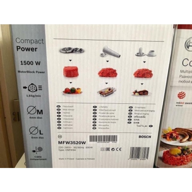 🍖 Máy xay thịt Bosch MFW3520W biến công việc nội trợ thành thú vui và tăng sự thích thú khi nấu ăn. Thiết kế nhỏ gọn, tinh tế. Máy có CÔNG SUẤT CỰC ĐẠI 1500W dễ dàng xay nhuyễn các loại thực phẩm trong thời gian ngắn với tốc độ xay 1.8 kg/phút. Với công suất xay 60-70kg/giờ máy phù hợp sử dụng tại các nhà hàng và quán ăn cũng như các cửa hàng bán thịt.