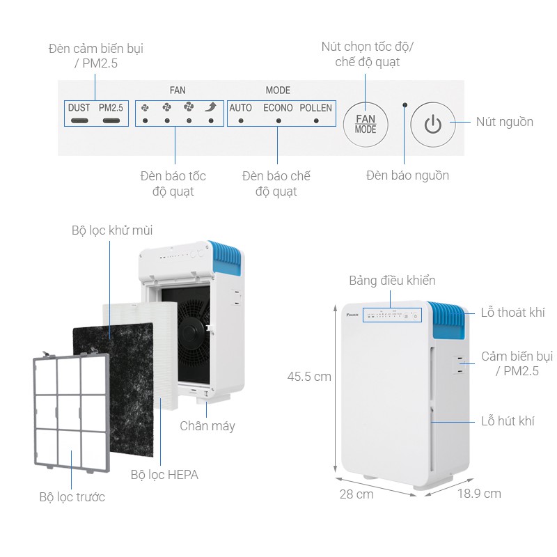 👉 Chế độ Econo - tiết kiệm điện năng: Thiết bị vận hành tự động chuyển đổi giữa chế độ "Yên tĩnh" và "Thấp" theo mức độ ô nhiễm không khí, đảm bảo lọc tốt mà không gây hao phí năng lượng điện.