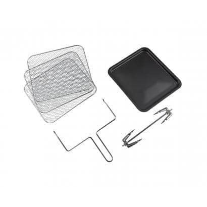 Phụ kiện kèm theo: 3 kệ nướng lưới, 1 khay chống dính, 1 thanh nhọn xiên gà, 1 kẹp gắp