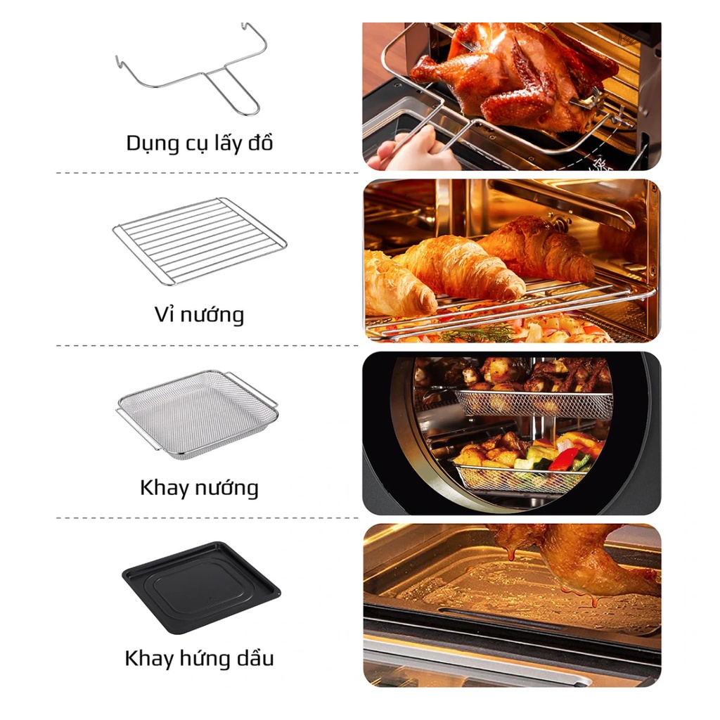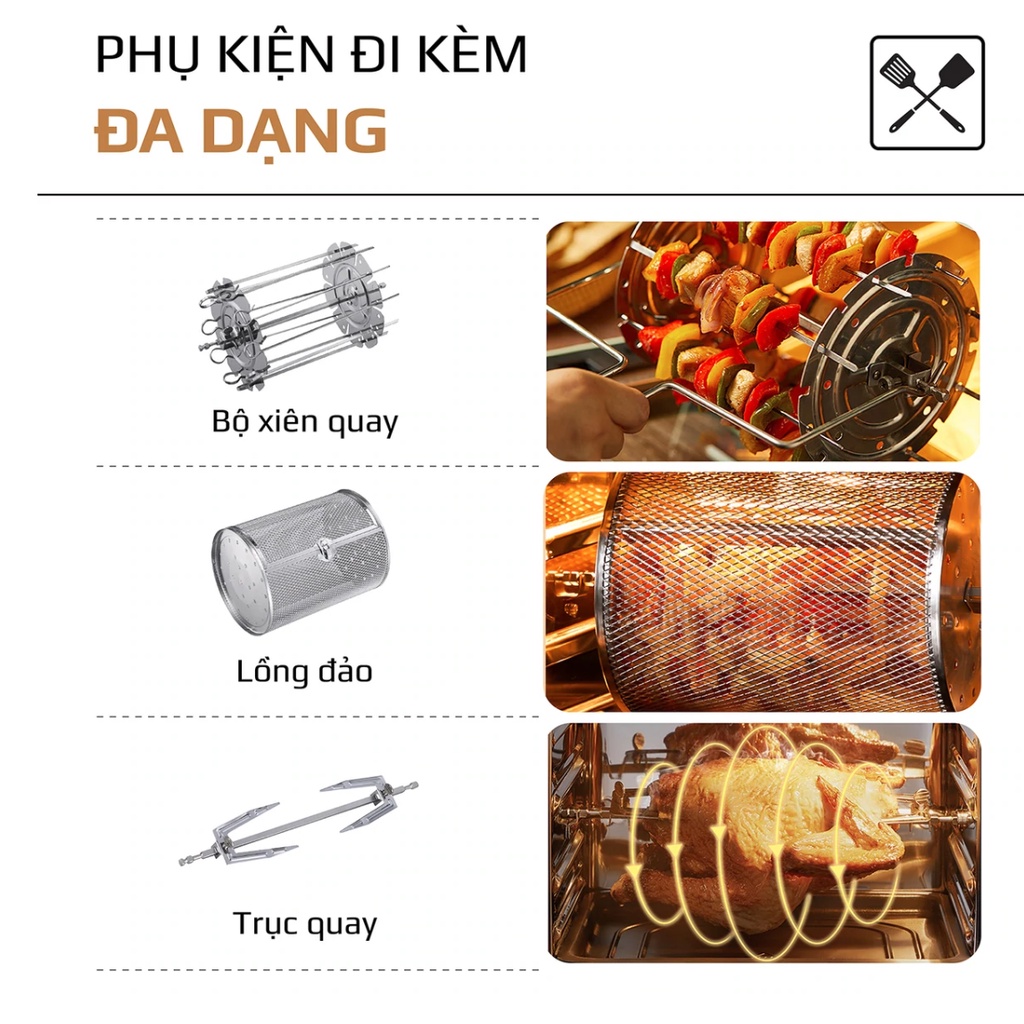 Phụ kiện: Lồng kẹp, lồng đảo, rổ lưới, giá treo dây, khay hứng dầu, trục xiên gà, khay lưới, lồng nướng