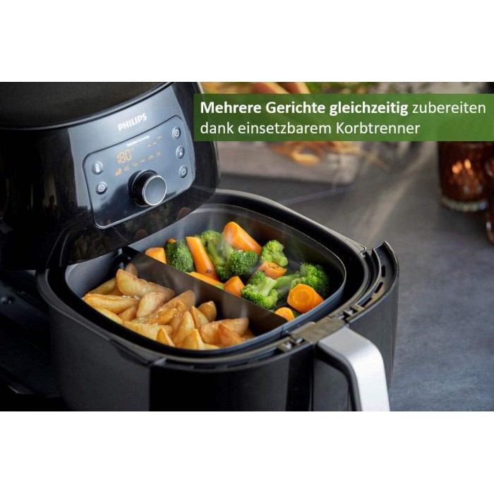- Nhờ vào GIỎ CHIÊN CÓ VÁCH NGĂN CÁCH, bạn có thể chuẩn bị các món ăn khác nhau cùng một lúc, mà không lo hương vị bị pha trộn. Điều đó giúp tiết kiệm thời gian. Tất nhiên, bộ đếm thời gian là không thể thiếu, thông báo cho bạn khoảng một đến 60 phút tùy theo mục đích. Nhờ chức năng giữ ấm, bạn có thể ăn các món ăn lần lượt.