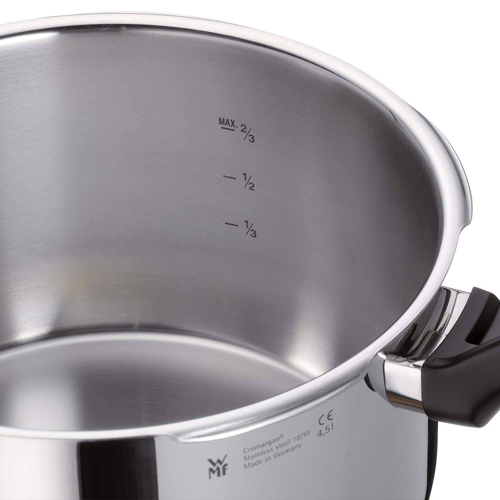🍀Chất liệu : Nồi áp suất WMF được làm bằng thép không gỉ Cromargan 18/10. Cromargan giúp sản phẩm bền, sáng, chống lại các va đập. Ngoài ra, Cromargan còn có tác dụng chống bị bào mòn do các loại thức ăn có tính axit, an toàn trong máy rửa chén.