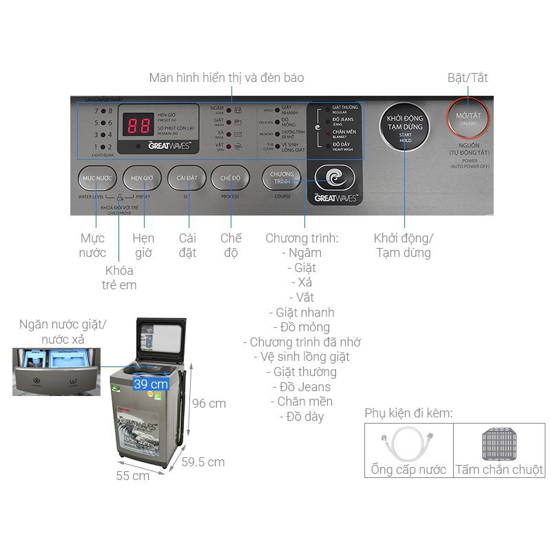 Công nghệ giặt:Hệ thống 3 thác nước, Greatwaves kết hợp 3 luồng nước, Lồng giặt ngôi sao pha lê