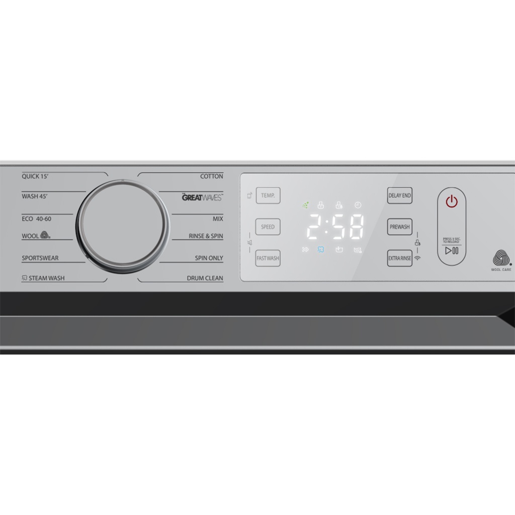 Chế độ giặt: 12 chương trình giặt: Đồ cotton, Greatwaves, Đồ hỗn hợp, Xả và vắt, Chỉ vắt, Vệ sinh lồng giặt, giặt hơi nước, Đồ thể thao, Đồ len, Giặt Tiết kiệm, Giặt 45 phút, Giặt nhanh 15 phút
