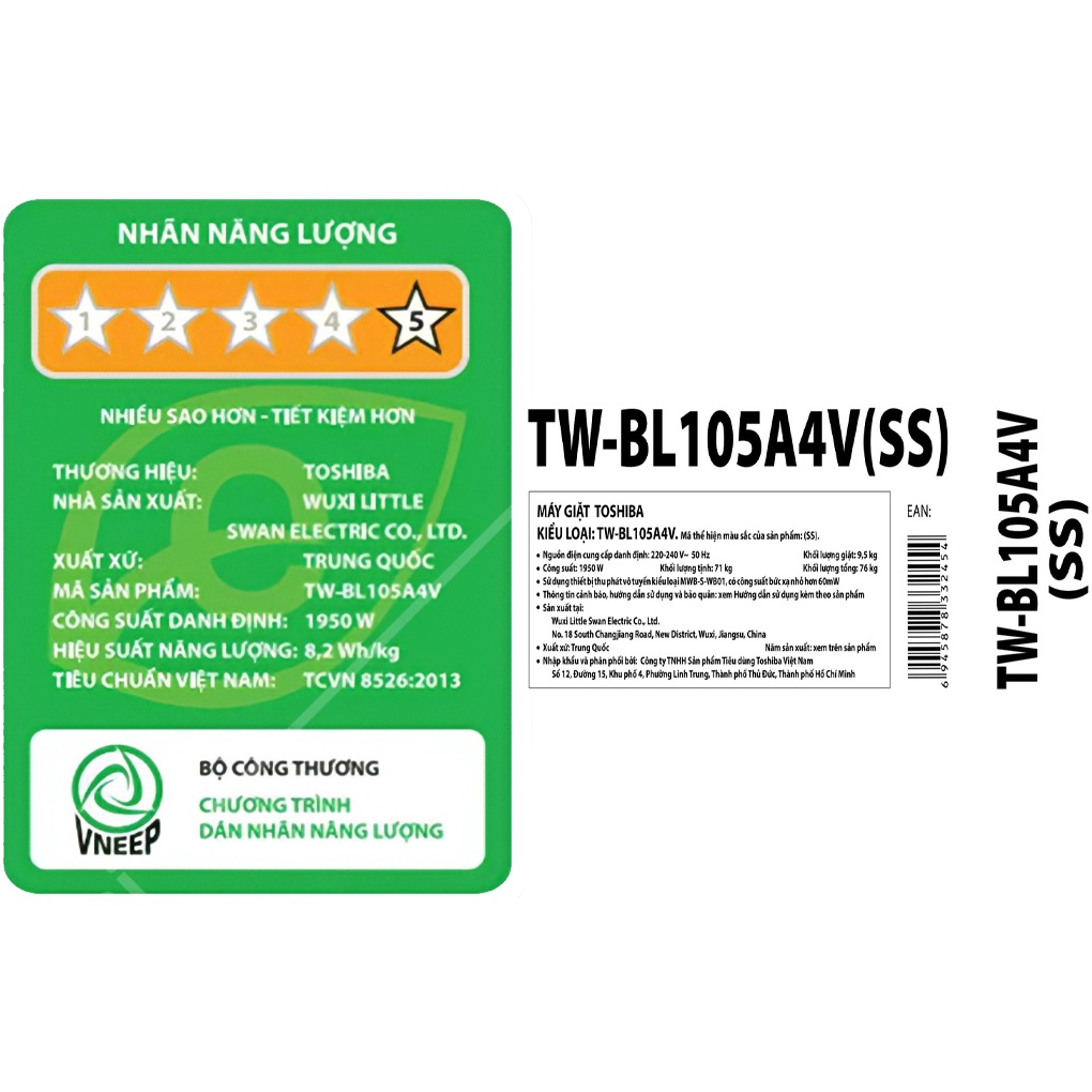 [Mã ELHAMS5 giảm 6% đơn 300K] [Toshiba BL105A4V] Máy giặt Toshiba inverter 9.5 kg TW-BL105A4V(SS)