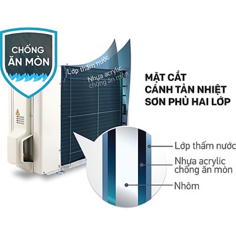 Tuổi thọ máy cao với cánh tản nhiệt dàn nóng được phủ 2 lớp chống ăn mòn, bo mạch có chức năng bảo vệ điện áp cao & thấp