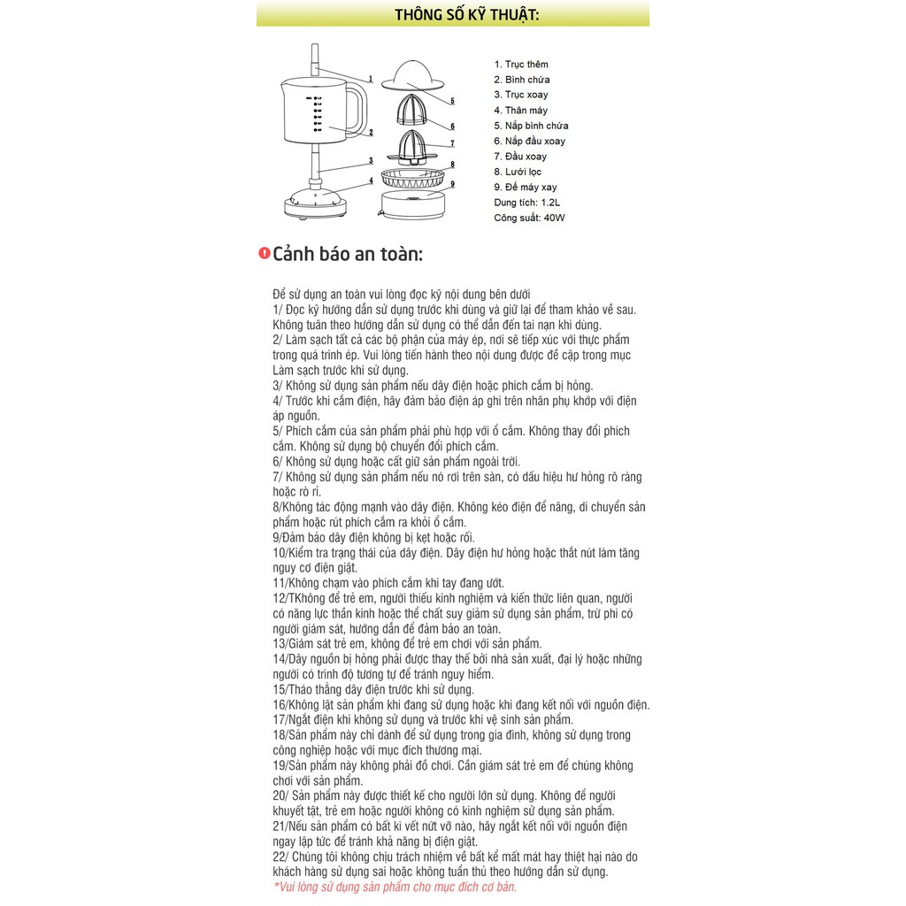 Cách sử dụng đơn giản, nhẹ nhàng, bạn chỉ cần ấn nhẹ miếng trái cây đặt trên nón ép là đã khởi động cho thiết bị thực hiện công việc ép nước cam. Sản phẩm sở hữu thiết kế nhỏ gọn với màu sắc trang nhã, không chỉ mang đến cho gia đình bạn những ly nước trái cây thơm ngon, bổ dưỡng mà còn góp phần tô điểm cho không gian bếp thêm tiện nghi, hiện đại.