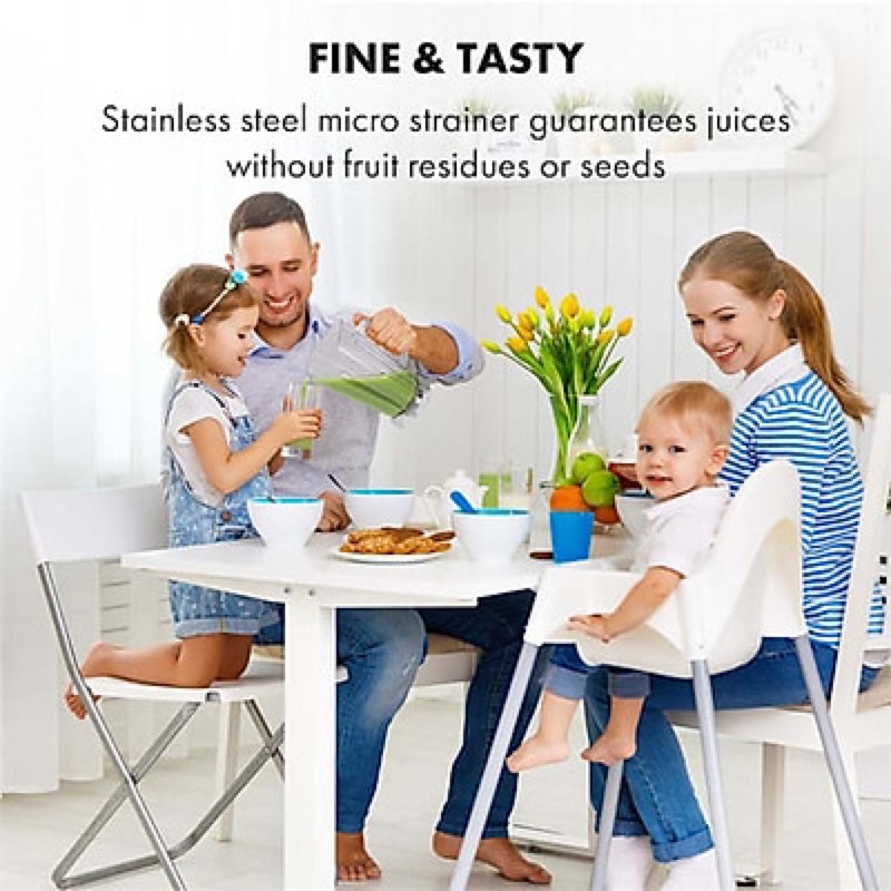 Đây là dòng máy ép chậm công suất lớn, ngoài ép được tất cả các loại rau củ thì có thể ép được các loại hạt. Chính vì vậy bạn có thể làm sữa đậu nành bằng máy ép này. Đường ống của máy ép rất rộng, lên tới 8,5cm nên phần lớn hoặc toàn bộ trái cây đều có thể ép được mà không cần cắt quá nhỏ hoặc đứng canh để cho vào liên tục. Máy ép vắt kiệt nước và bộ vi lọc cực kỳ tốt để đảm bảo bã và nước uống được phân loại triệt để. Nước ép ra sánh mịn không bị phân tầng. Và điều tuyệt vời nhất chiếc máy mang lại là nó giữ nguyên tới 98% lượng vitamin, khoáng chất có trong rau củ quả, không làm mất đi hương vị tự nhiên vốn có của chúng.Máy ép chậm Klarstein 400W