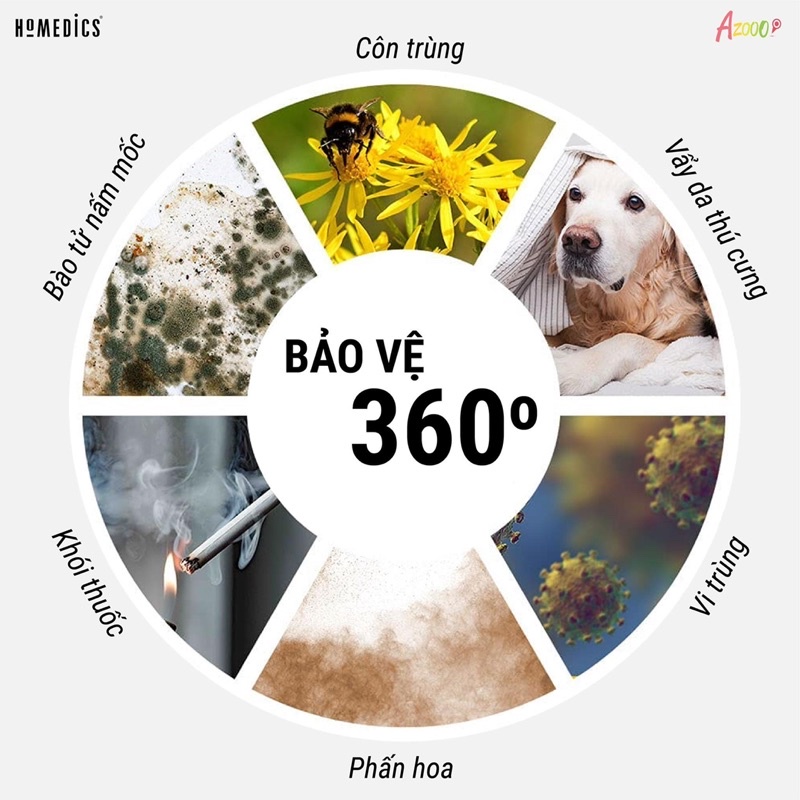 HoMedics AP-T40WT-GB sử dụng bộ lọc True HEPA 360 độ giúp loại bỏ 99,97% vi khuẩn và các chất gây dị ứng trong không khí. Bộ lọc HEPA không chỉ tiêu diệt vi trùng và virus nhỏ tới 0,3 micron mà còn loại bỏ mùi hôi gấp 5 lần so với các bộ lọc thông thường.
