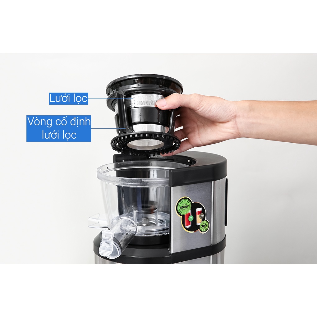 ● Công nghệ ép bằng trục vít giảm ma sát giữ lại 99% lượng vitamin hoa quả với công suất 400W và 60 vòng/phút ép nhẹ nhàng nhưng năng suất caoTrục vít máy ép chậm sẽ từ từ nghiền nát hoa quả, rau củ và đẩy nguyên liệu vào lưới lọc mà không gây ra bất cứ lực ma sát hay lực ly tâm nào với nước ép, một bộ phận tách bã sẽ đẩy bã ra ngoài và nước ép chảy ra một cách tự nhiên.