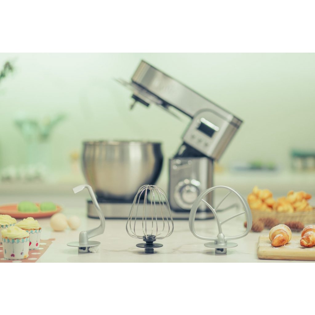 ☛ Đi kèm với máy là 3 đầu đánh với 3 chức năng khác nhau: đầu đánh bột, đầu đánh trứng, và đầu để trộn thức ăn. ☛ Cả ba đều được làm bằng hợp kim không gỉ, rất bền bỉ và có hiệu suất làm việc cao.