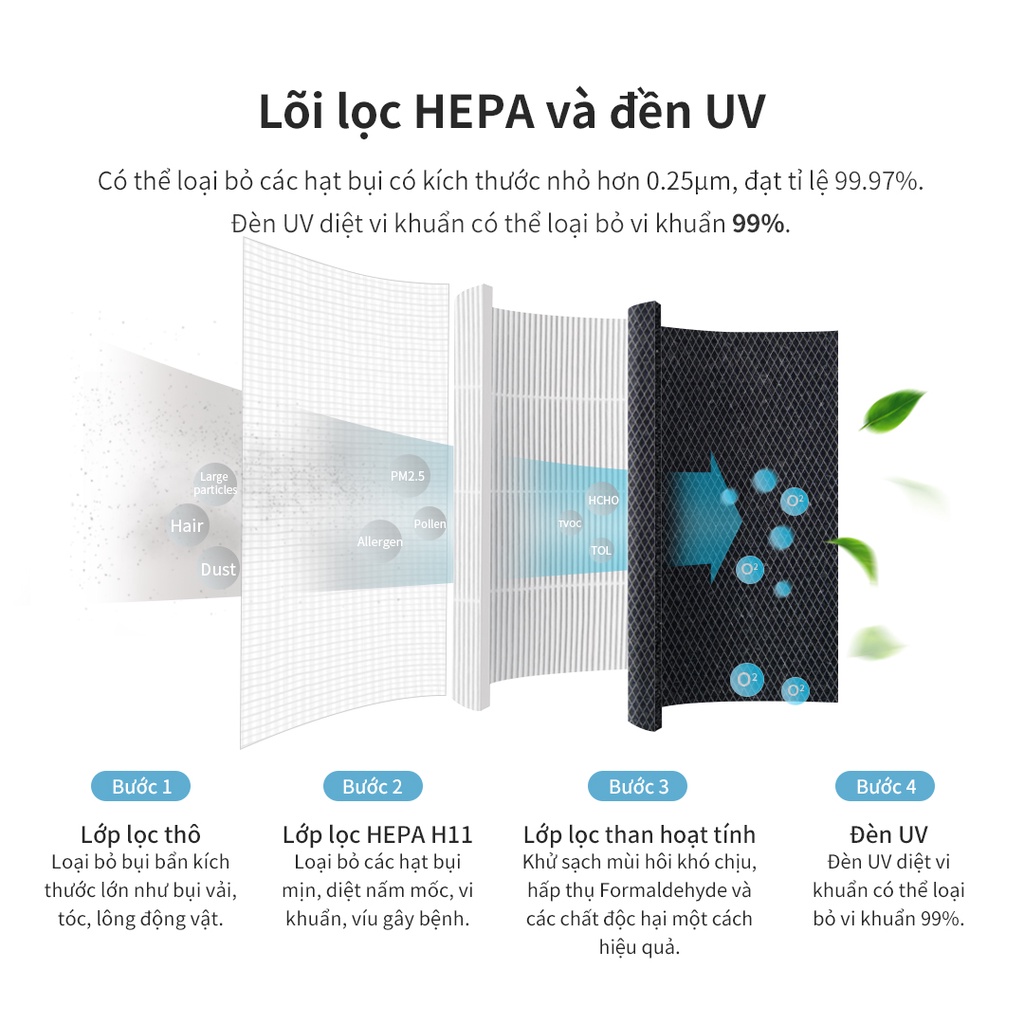 - Lớp lọc Hepa: Loại bỏ các hạt bụi mịn, diệt nấm mốc, vi khuẩn, virus gây bệnh. Lõi lọc Hepa có thể loại bỏ các hạt bụi có kích thước nhỏ hơn 0.25μm, đạt tỉ lệ 99.97%