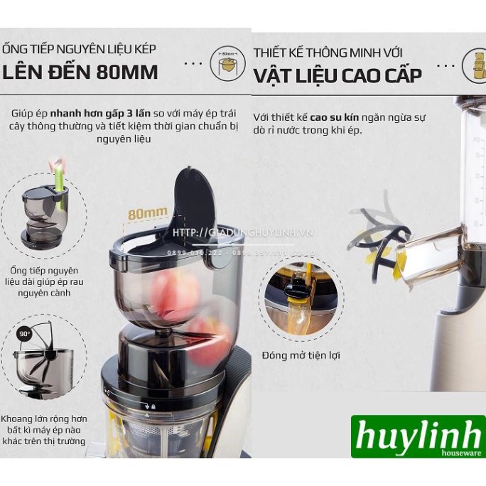 - Ống - Họng thả trái cây đôi: 1 lớn (8x8) 1 nhỏ, giúp ép thuận tiện cả trái cây nguyên trái lẫn trái cây nhỏ, hay rau củ.
