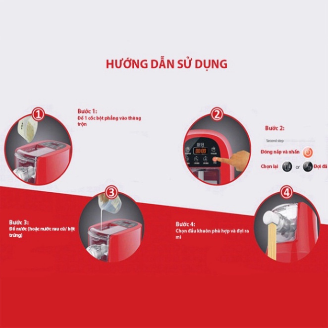 + Phụ kiện đi kèm: 13 Khuôn làm mì, bún ...,1 cốc đo bột, 1 cốc đo nước, 1 đầu gạt, 1 khay làm sủi cao (Shui jiao)