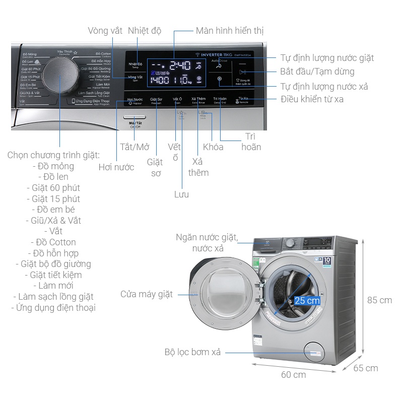 Tiện ích : Hẹn giờ giặt , Khóa trẻ em, Định lượng tự động, Hẹn giờ kết thúc, Vệ sinh lồng giặt, Điều khiển máy giặt từ xa thông qua ứng dụng Electrolux Life, Đèn chiếu sáng lồng giặt