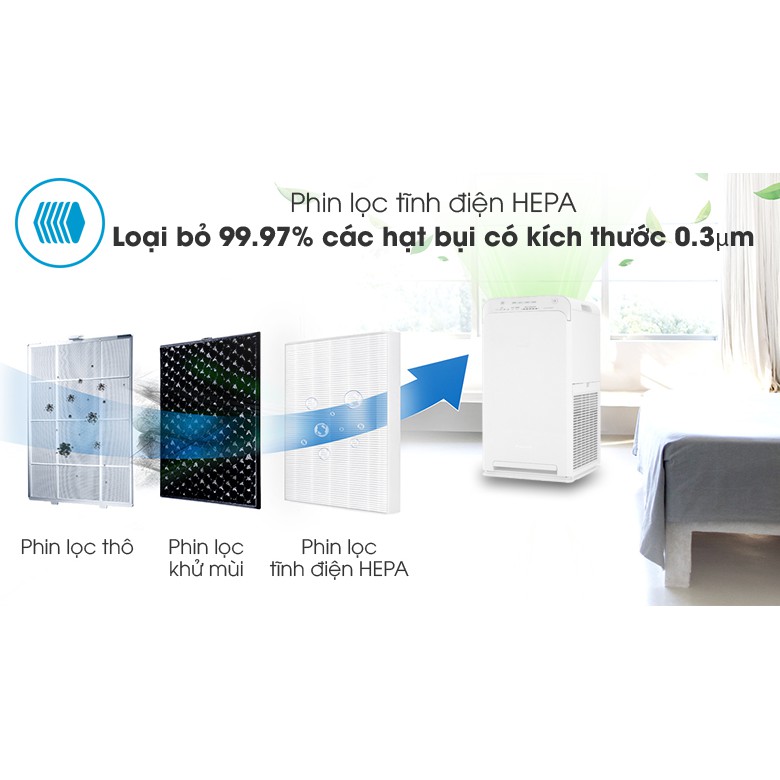 Vượt trội hơn phin HEPA thông thường, phin lọc HEPA của máy lọc khí Daikin được nạp tĩnh điện nên có khả năng lọc không khí tối ưu hơn. Bản thân sợi của phin lọc được nạp tĩnh điện nên có khả năng hút bụi một cách hiệu quả, loại bỏ đến 99.97% các hạt bụi có kích thước nhỏ đến 0.3 µm*