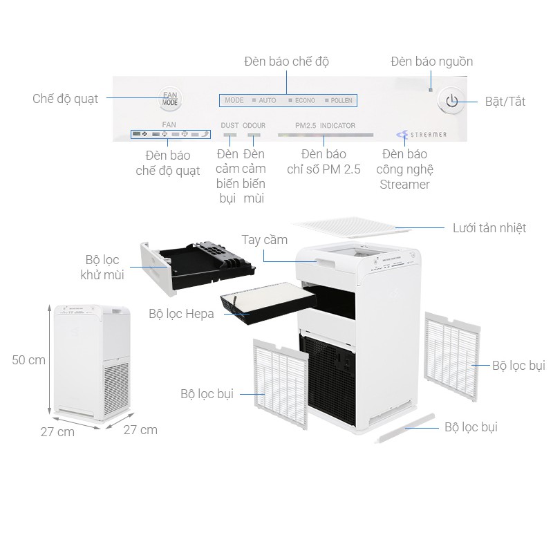 Streamer giữ cho phin lọc mùi và phin lọc Hepa luôn sạch, giúp duy trì được hiệu suất lọc của phin. Phin lọc luôn sạch còn giúp giảm tối thiểu lượng bụi bẩn bị trộn lẫn vào luồng khí sạch thổi ra khỏi máy.