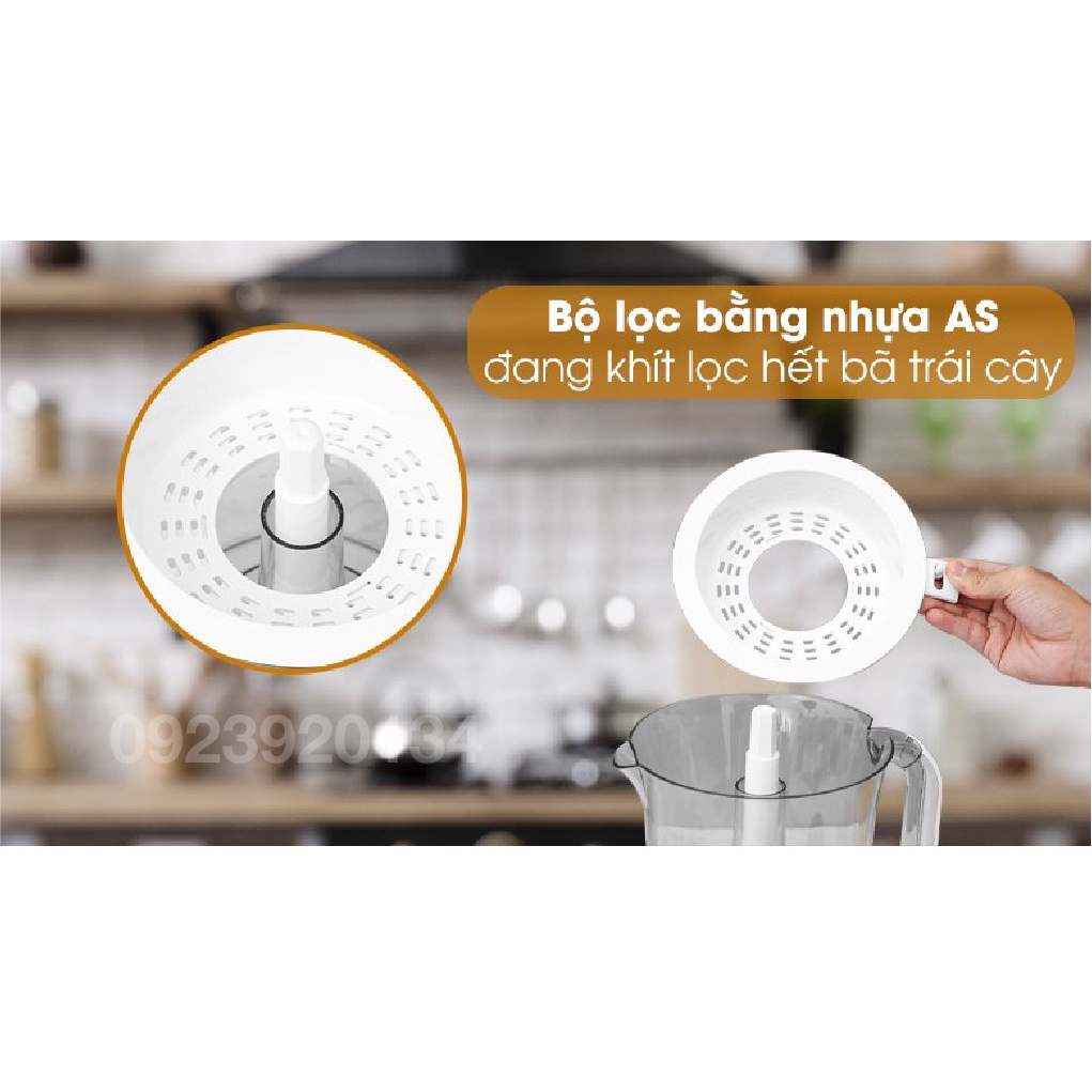 Dung tích bình chứa 1.5 lít đáp ứng nhu cầu cho gia đình từ 2 - 4 thành viên. Ngoài ra, bình đựng nước ép được làm từ chất liệu nhựa AS nên có độ cứng cao, kháng vỡ, dễ chùi rửa. Đặc biệt loại nhựa này rất an toàn, không ảnh hưởng đến sức khỏe người dùng.