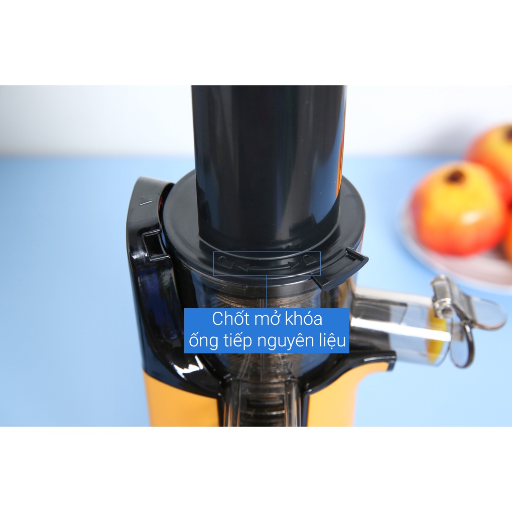 ●Ống tiếp nguyên liệu dạng nửa hình trụ, chiều ngang miệng 40 mm hỗ trợ ép trái cây cỡ nhỏ như dâu tây nguyên trái