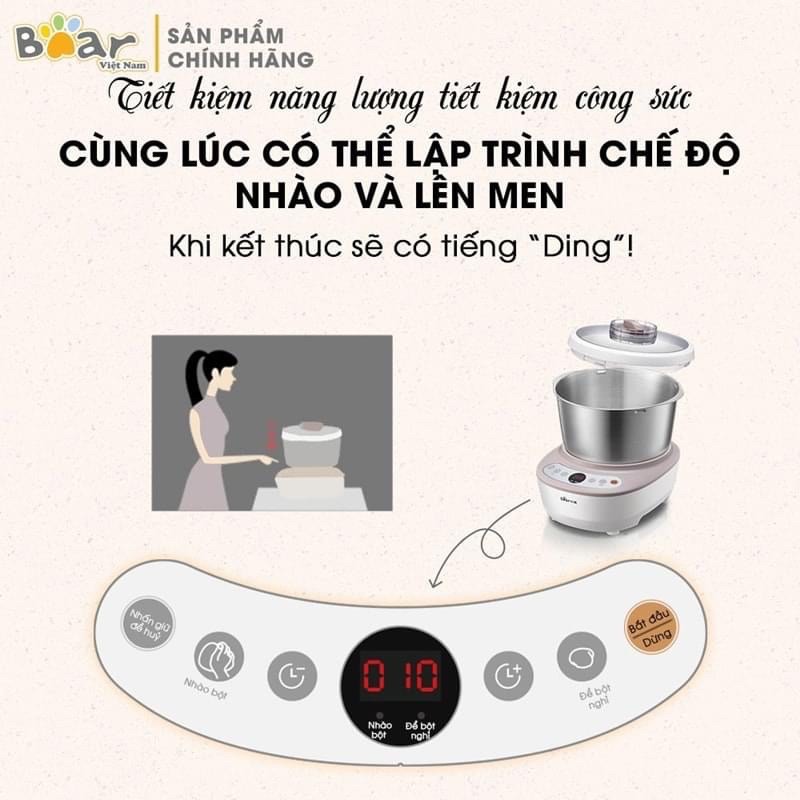 - Chức năng hẹn giờ với các nấc thời gian ủ và nhào bột thuận tiện. Người dùng có thể tự do chọn lựa chế độ và thời gian theo yêu của mỗi loại bánh.