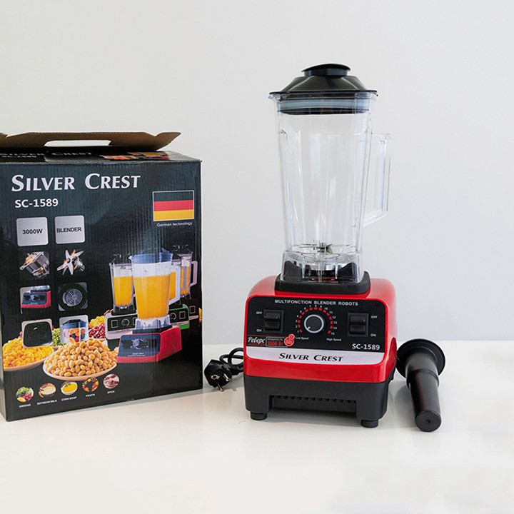 Máy xay sinh tố Silver Crest SC-1589 phục vụ cho công việc xay, nghiền hoa quả, ngũ cốc… tại các quán sinh tố, quán cafe, quán kinh doanh sữa đậu nành, sữa ngô, sữa mè đen… hoặc có thể sử dụng chiếc máy này để xay bột nghệ, gạo lứt… rất đa năng. Chiếc máy xay sinh tố công suất lớn này được sản xuất với công suất lớn lên tới 3000W nên nó có thể xay, nghiền được nhiều nguyên liệu một cách nhanh chóng, ngoài các nguyên liệu trên thì nó còn có khả năng xay được đá rất hiệu quả.
