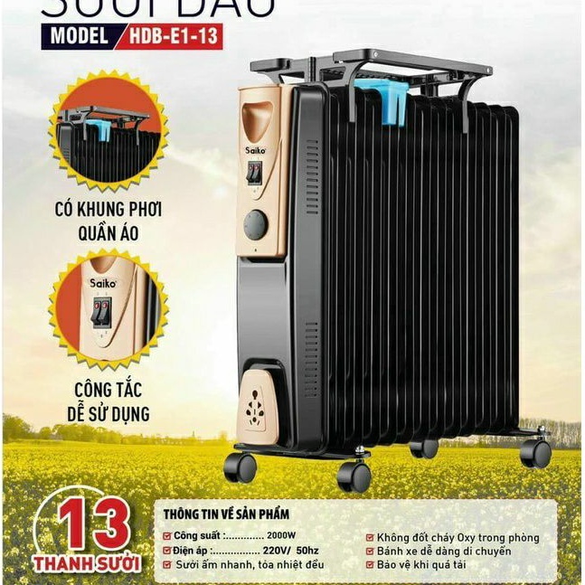 Thiết Bị Điện Gia Dụng > Thiết bị điện gia dụng lớn > Máy sưởi || [Mã ELHA22 giảm 5% đơn 300K] Máy Sưởi Dầu 13 Thanh Saiko CDN-RY2000-13AT (Có Giá Phơi Đồ) - Bảo Hành 18 Tháng Toàn QuốcCòn hàng