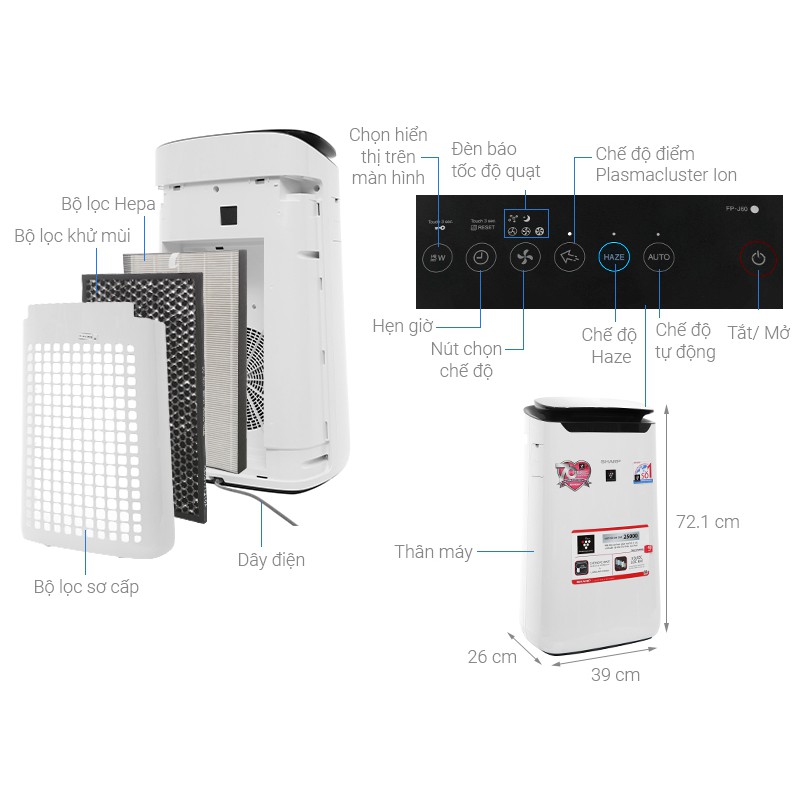 Giới thiệu [Mã ELHA10 giảm 6% đơn 5TR] Máy lọc không khí Sharp FP-J60E-W Inverter - Diện tích 40m² - Bảo hành 12 tháng