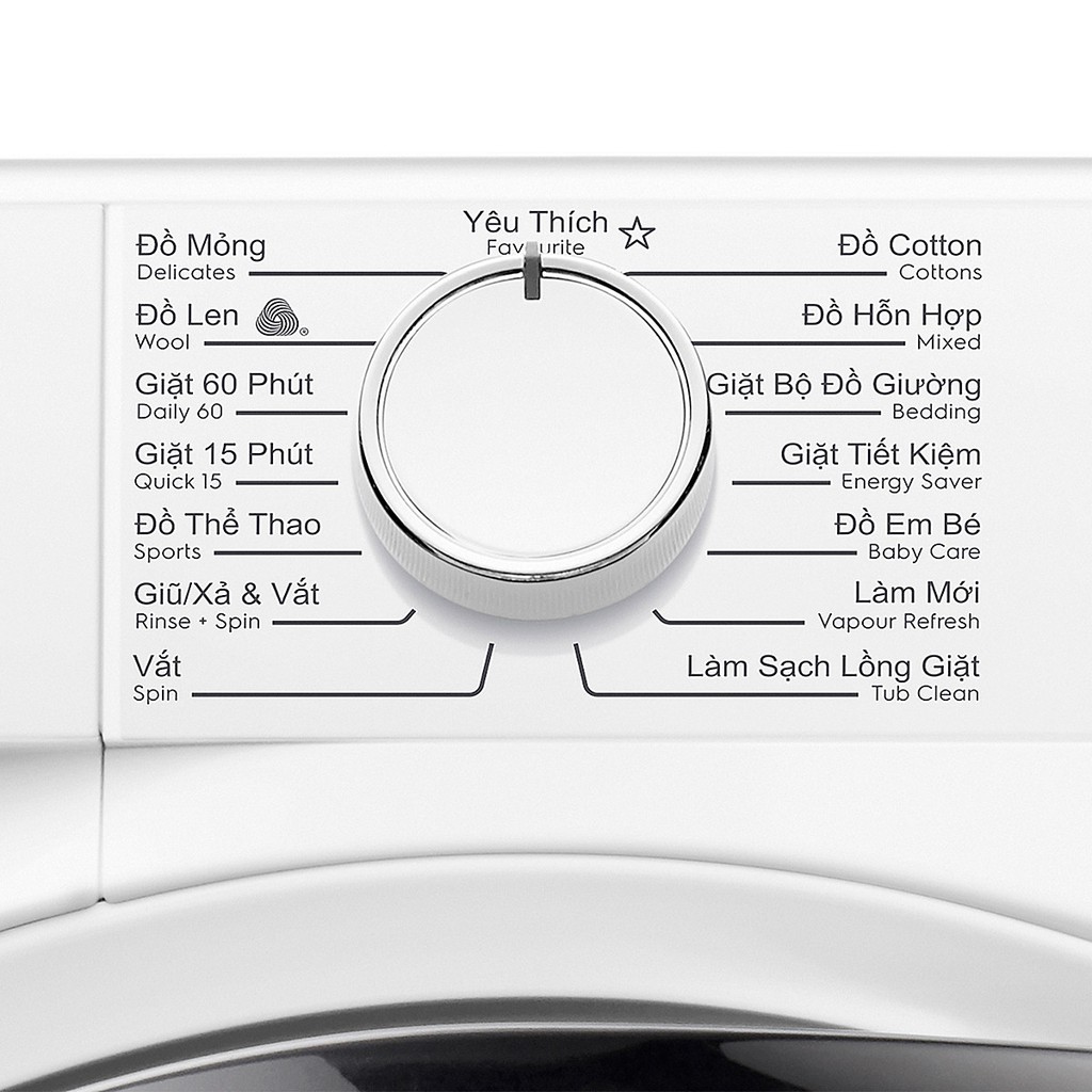 Tiện ích: Thêm quần áo khi máy đang giặt, Khóa trẻ em, Vệ sinh lồng giặt, Hẹn giờ giặt