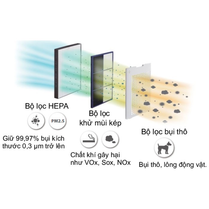 Loại bỏ bụi, bụi mịn PM2.5, khói và mùi hiệu quả với bộ 3 màng lọc: Màng lọc thô, Màng lọc HEPA, Màng lọc khử mùi