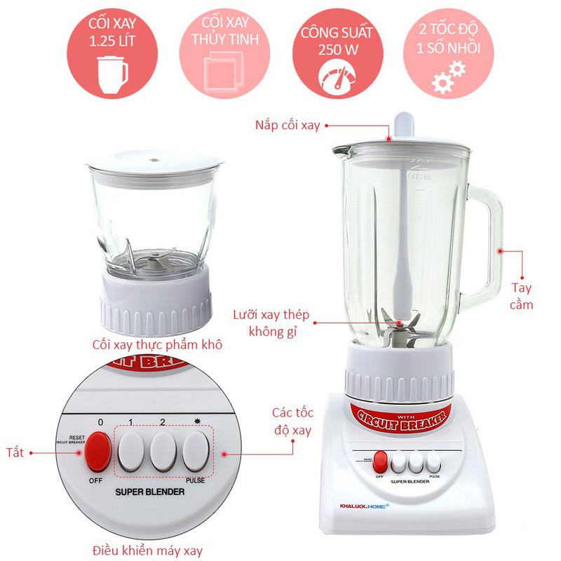- Bộ sản phẩm đa năng: Máy xay sinh tố Khaluck KL-303 có Cối xay thủy tinh dung tích 1.25L dùng cho mục đích xay sinh tố trái cây cho cả nhà. Cối xay cỡ vừa dùng để xay các loại rau quả. Bạn dùng cối xay khô khi xay các loại gai vị như tiêu, hành, tỏi. Mỗi cối có dao xay chuyên dụng đi kèm.