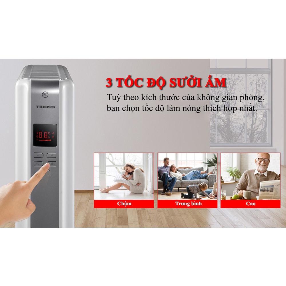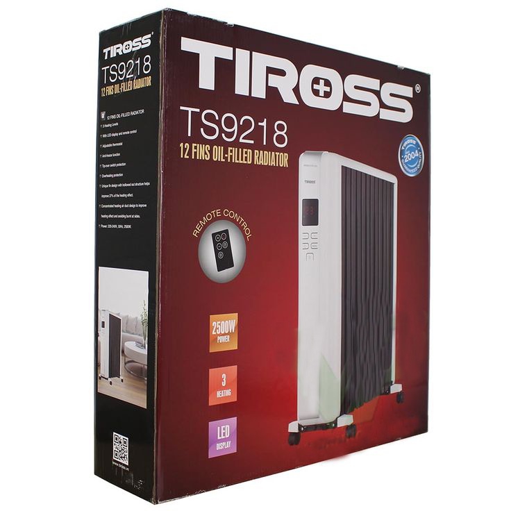 - Máy sưởi dầu 12 thanh chống bỏng Tiross TS9218 với công suất 2500W cùng với 12 thanh nhiệt, quạt gió đối lưu giúp không khí được làm ấm nhanh chóng nhưng không làm khô da và kích ứng da, khó chịu như một số loại máy sưởi thông thường. Điều khiển từ xa