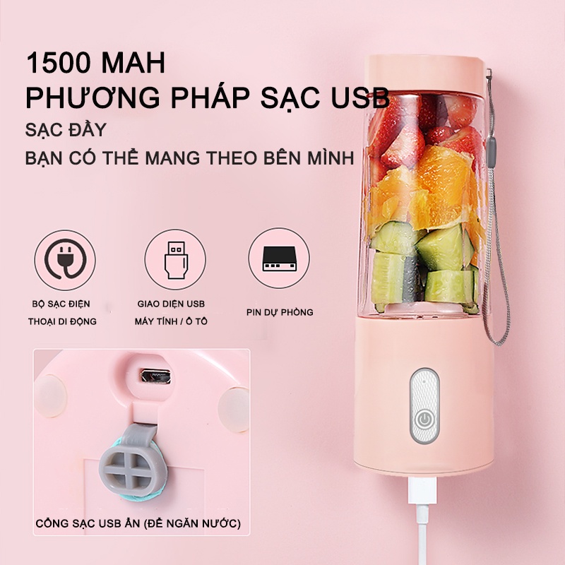 • Máy xay Sinh tố mini tiện lợi hoạt động không cần cắm điện, pin sạc 1500 mAh 1 lần sạc sử dụng được 10 lần.