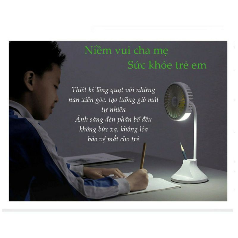 Quạt sạc mini USB đặt bàn đa năng 4 trong 1Chức năng đèn học, đèn đọc sách với ánh sáng dịu, không lóa mắt