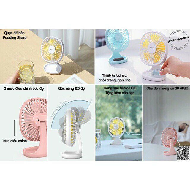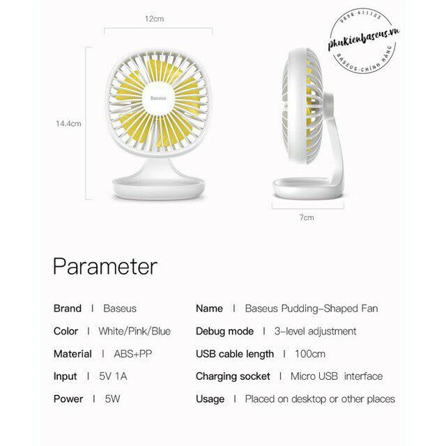 Quạt mini để bàn Baseus Pudding-Shaped Fan sử dụng cổng sạc Micro USB (3 mức tốc độ - Mini USB Air Cooling Fan Clip Desk Fan) được làm từ chất liệu nhựa cao cấp ABS + PP, siêu mịn thân thiện với làn da cho bạn cảm giác mềm mại và thoải máiSản phẩm thiết kế gọn nhẹ, sang trọng và dễ thương. Phù hợp với nhiều không gian sinh hoạt và làm việc khác nhau từ bàn làm việc, phòng ngủ, trong xe hay bất cứ nơi đâu Có sức gió mạnh vừa và tự nhiên nhờ cơ cấu cánh quạt và bộ khung bảo vệ có thiết kế thông minh có tác dụng khuếch tán luồn gió, cho cảm giác tự nhiên và thoải mái hơn khi sử dụng Sức gió thổi nhẹ nhàng, cực êm , an tâm sử dụng trong môi trường làm việc yên tĩnh. Có thể điều chỉnh góc quạt lên đến 120 độ (lên/xuống)