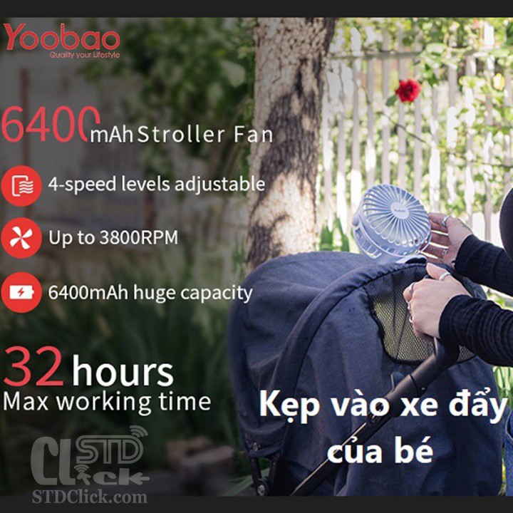QUẠT KẸP ĐỂ BÀN YOOBAO Y-F04 6.400MAH CHÍNH HÃNG có thể hoạt động khi kẹp cũi, bàn làm việc, cầm tay, kẹp xe đẩy của em bé khi ra ngoài. Rất tiện khi đi làm, đi du lịch, đi công viên, đi dạo ngoài trời...